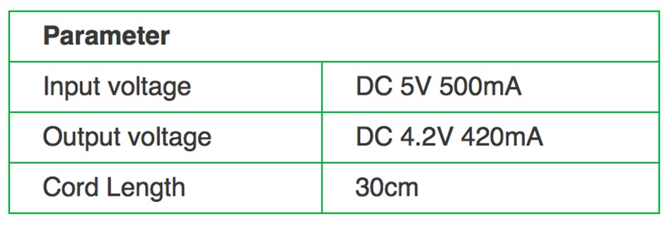 ParameterInput voltageDC 5V 500mAOutput voltageDC 4.2V 420mACord Length30cm